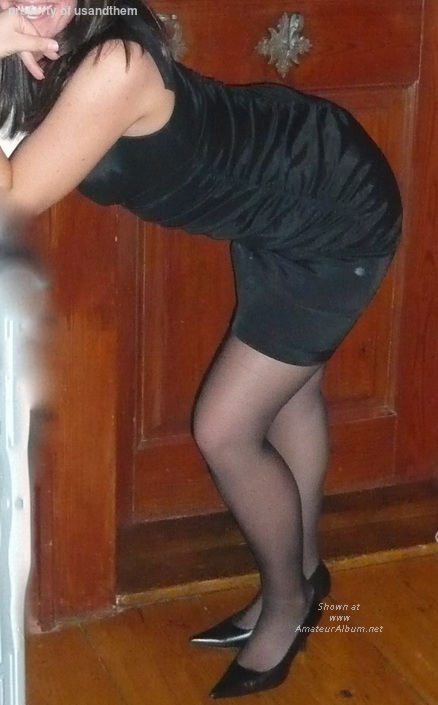black dress, stockings and high heels