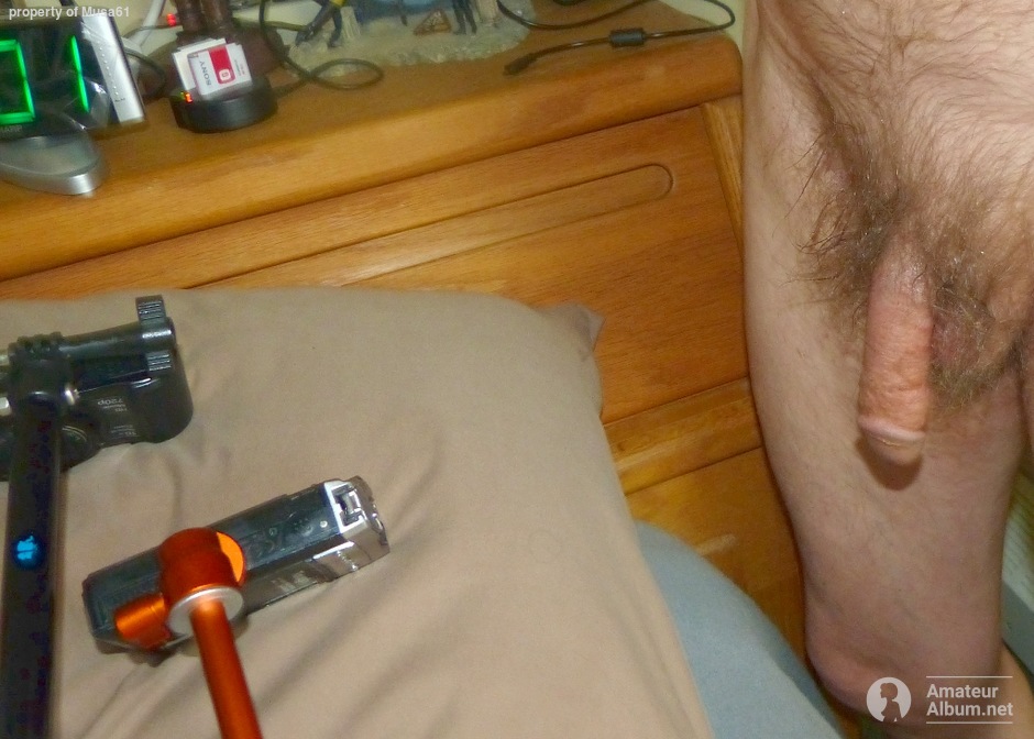 My thick dick as I stand near a pillow on my bed... one of my camera battery charging stations is near by. Late April 2025. FZ150 camera was used.