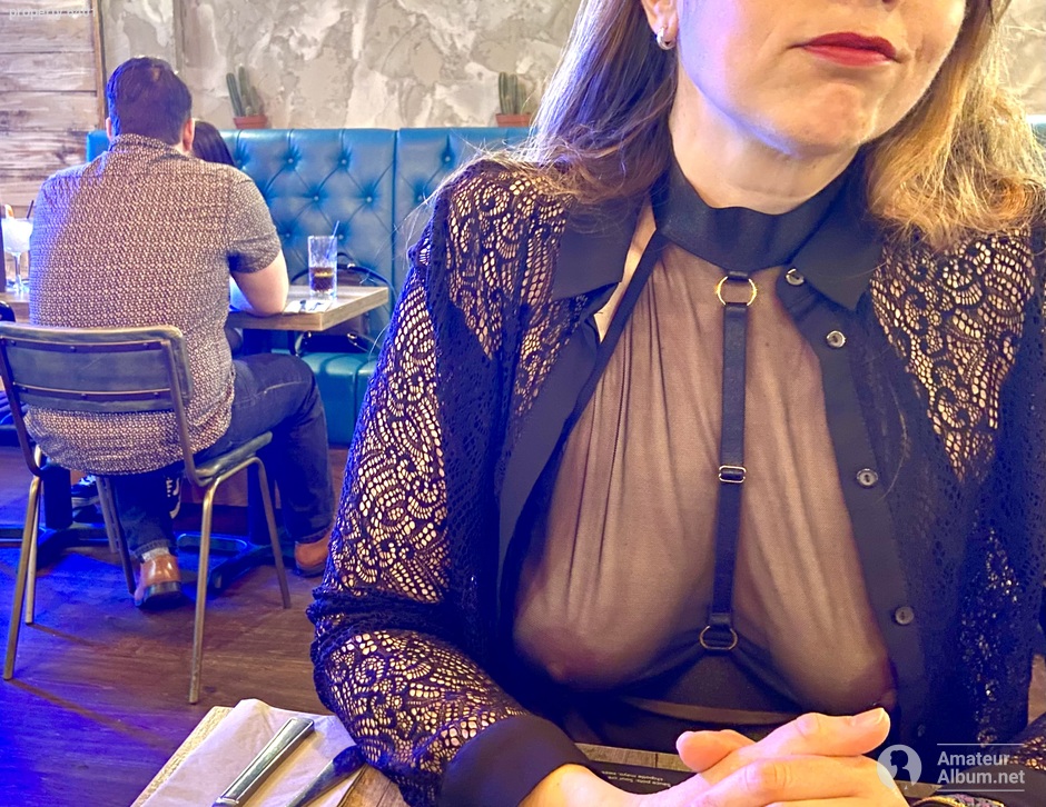I wonder how much food I would be able to eat, knowing that you were pantyless and showing those sweet tits.