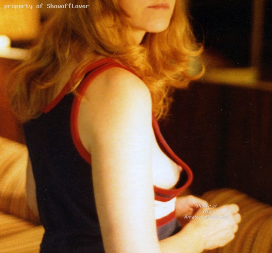 Young married exhibitionist chick showing off a small tit and big nip in a sleeveless top worn numerous times in public to please the gents and voyeurs.