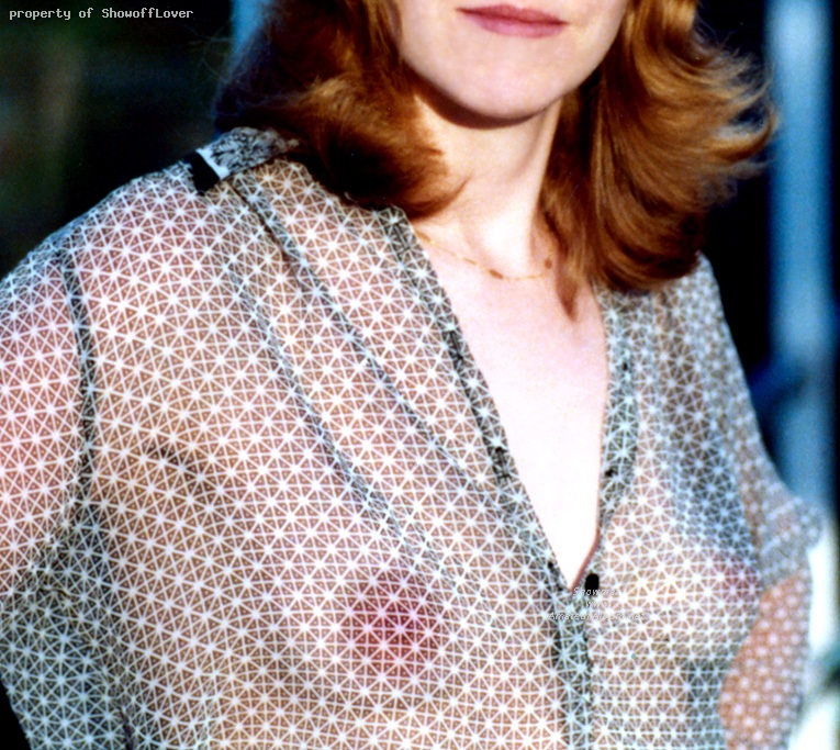 Young married chick showing off her tits and nips in a very see-thru blouse worn out at night and at poker games.