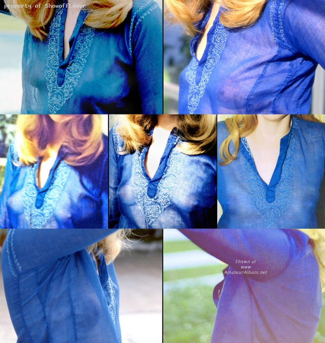 Filesize: 695Kb | | Young married exhibitionist chick in a variety of poses in her see-thru blouse worn in public on numerous occasions to attract the gents and please the voyeurs | |