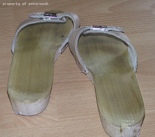 Wooden sandal.Well worn!And it can make loud flip-flop sound by baresoles during walking!Really fits on big housewife's,real womans feets!At office or at 'home or on streets