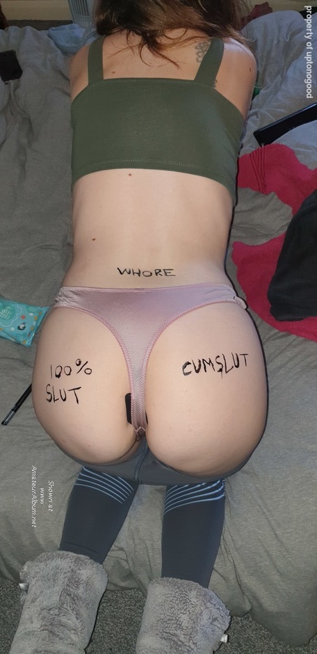 I could just pull those knickers to the side and slide my rock hard cock inside your little sluts pussy right now!!