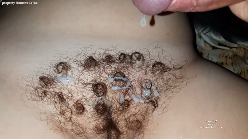 Big cumshot on hairy curly pussy of wife