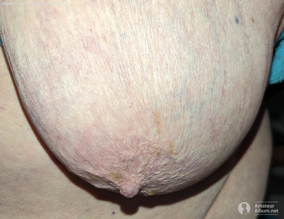 Anyhow, ladies, hormone therapy is probably the answer to keeping your girls firm and smooth. My nipple here is poofed out due to having used the twist-type sucking toy, and pushing down while twisting and using Vaseline for a seal - on me, kinda, sorta - the wrinkles, LOL!!! | |