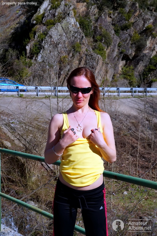 On the way to Andorra, we stopped at a beautiful bridge over the river! and My bitch posed showing her breasts and erect nipples!