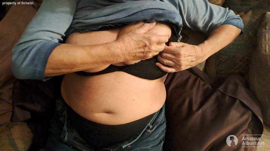 Schatzi auf der coutsch läßt die geilen Großen Titten frei. Ein dicker Schwanz dazwischen wäre schön.